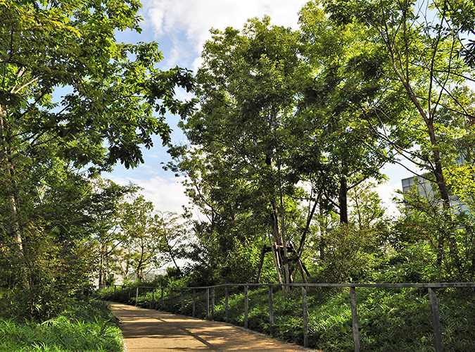 Using only indigenous plants from planters with soil from Tokyo and the surrounding area, zoning and vegetation stratification is incorporated, and through flora that develop flowers and fruit, the woodland is anticipated to serve as a habitat for various wildlife.